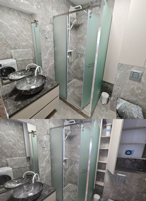 Простора душова зона, дизайнерська сантехніка, пральна машина, бойлер 80 л схований в шафі.