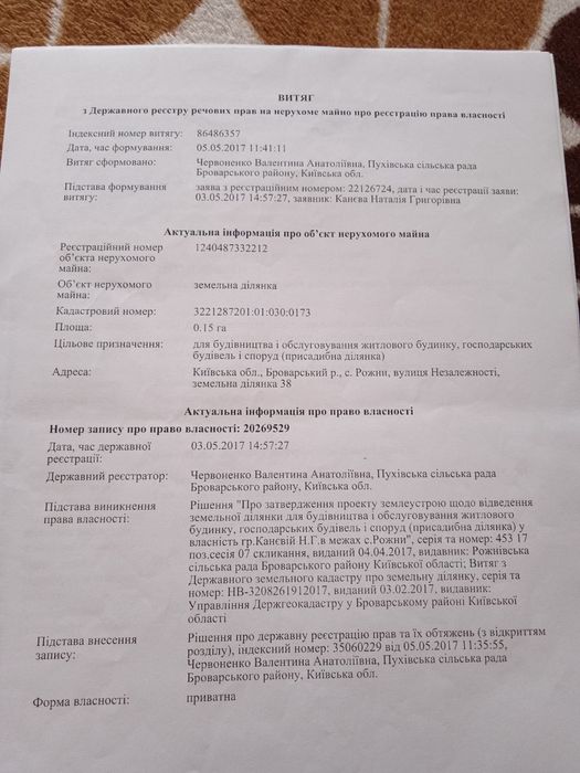 Продаж земельної ділянки село Рожни, Бровари; Продається земельна ділянка площею 15 соток, с. Рожни Броварський район Київська область. Ділянка не кутова, знаходиться в самому селі, неподалік р. Десна. Поруч є збудовані дома. Поруч є зупинка, неподалік школа, дитсадок, крамниця RC, церква, пошта. Ділянка приватизована. Від метро Лісова 25 - 30 км, можно їхати по Броварському проспекту через Пухівку, і через Троєщину. Гарне та затишне місце для будівництва оселі, як для відпочинку як дачи, і для постійного проживання. Ціна 40000 $. Телефон 06*********90 ( і вайбер) Наталія (хозяйка)
