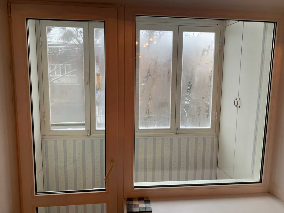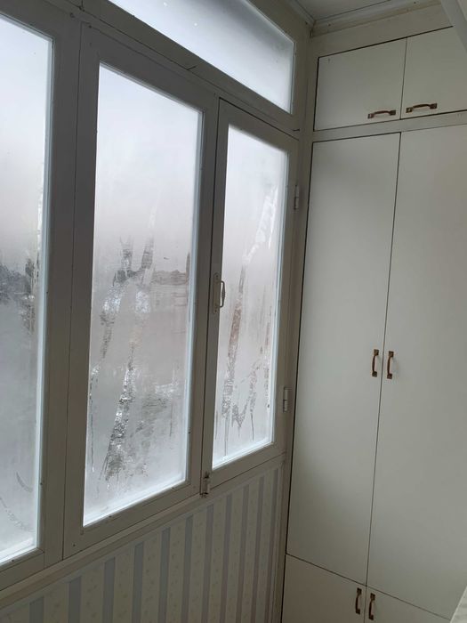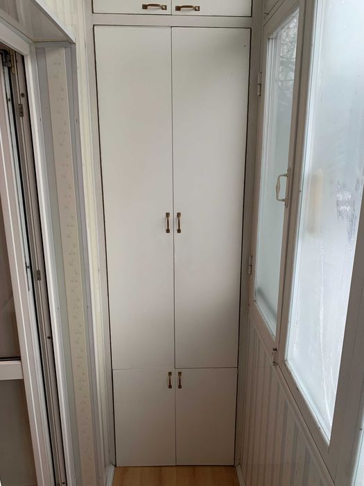 Балкон теплий засклений, дерев'яні рами, стіни обшиті пластиком, з обох боків шафки з полицями.