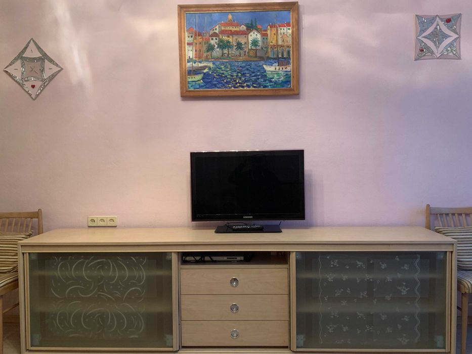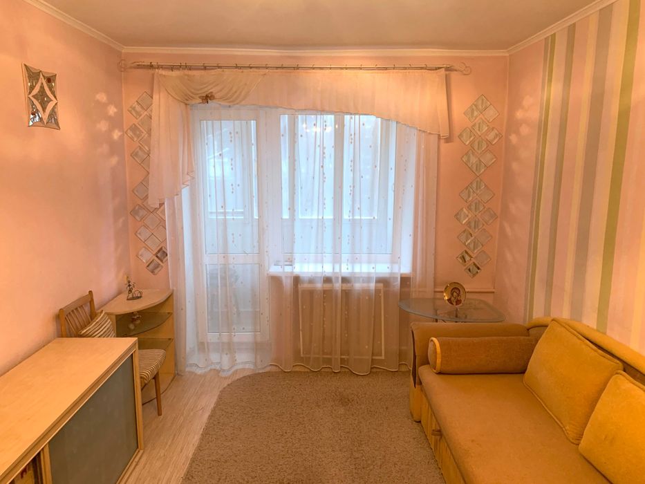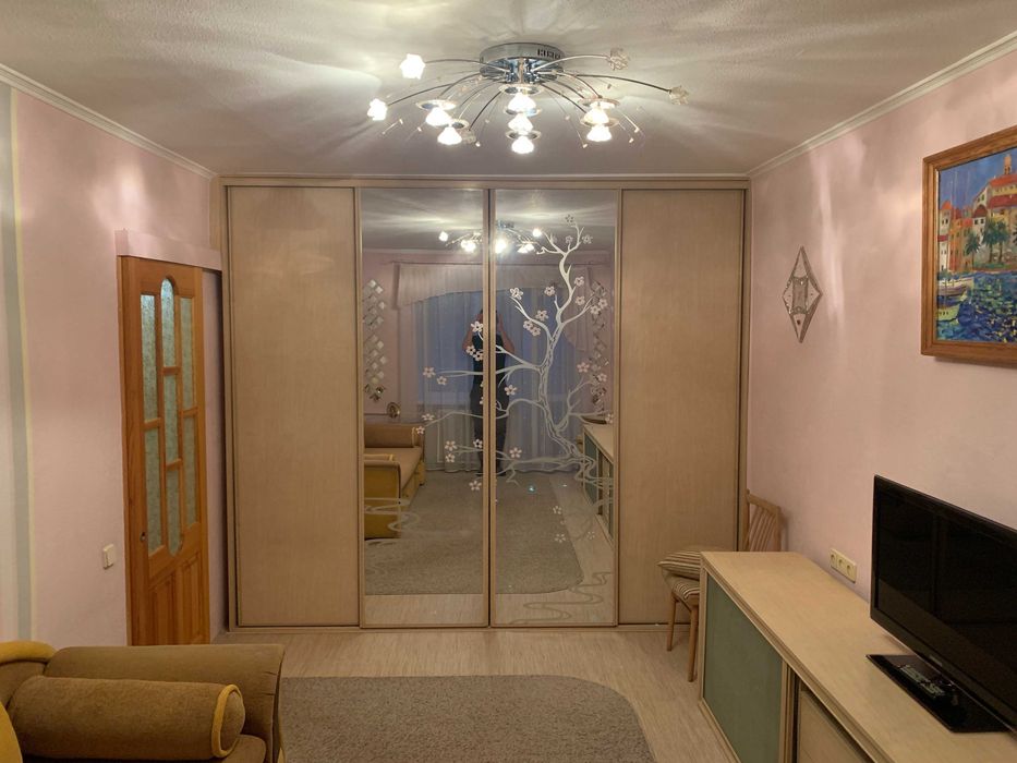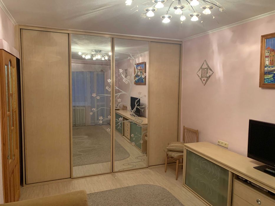 В кімнаті велика шафа купе, розкладний диван, велика тумба з полицями та шухлядами, кутова тумба з полицями, телевізор Samsung 32', стільці, столик біля дивану, двері в кімнату розсувні, металопластиковий балконний блок.