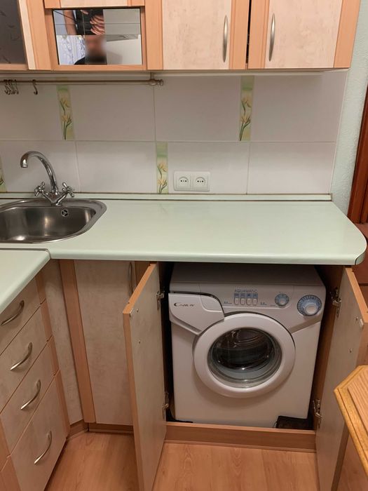Кухня повністю мебльована - гарнітур, куточок з дерев'яним розкладним столом та 4 табуретами, металопластикове вікно і замінена батарея, холодильник Liebher, газова плита та газовий лічильник, витяжка, пральна машина Candy, маленький телевізор LG (на фото немає), антресоль для зберігання над входом.
