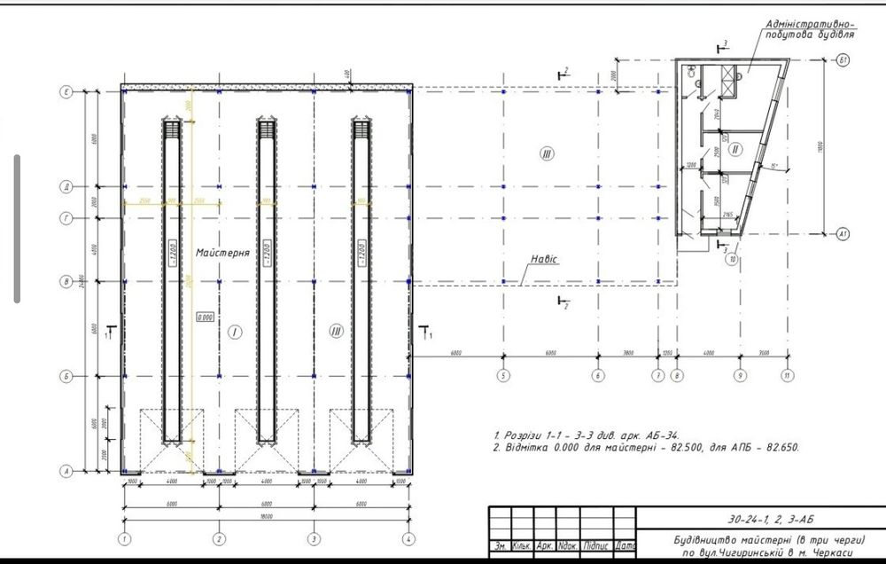 Є проект з дозволами на будівництво під вантажне СТО на 5 боксів(3шт по 24м із ямами та 2шт по 12м) а також адмін.будівлю (розділене на 3 черги)