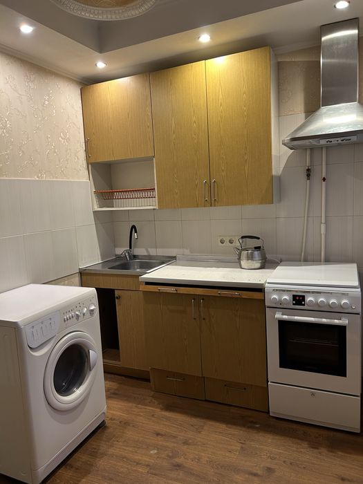 Оснащена всіма меблями та побутовою технікою: холодильник, мікрохвильова піч, плита (газ+електро), витяжка, пральна машина, бойлер. Диван, два розкладних крісла, велика шафа, тумба, засклений балкон.