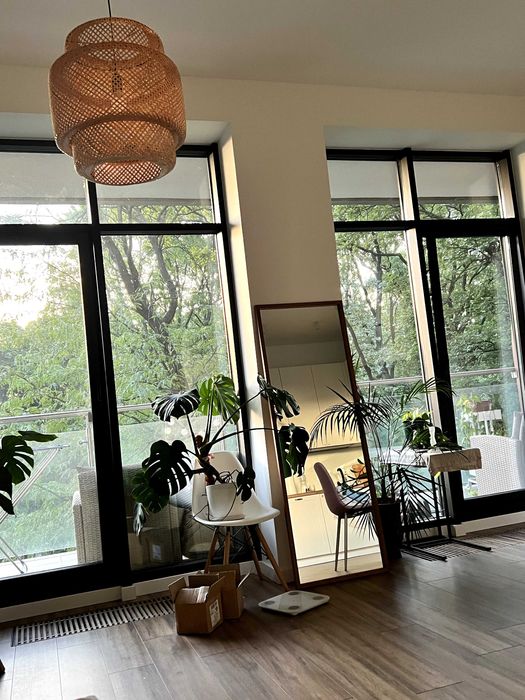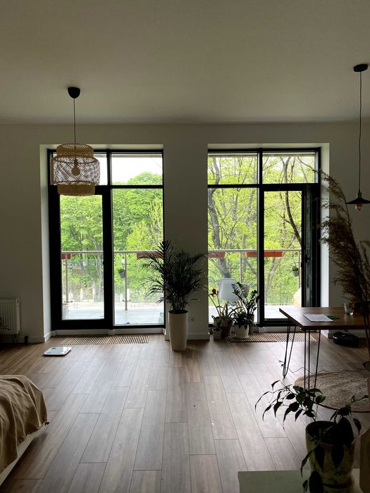 Простора кімната поєднана з кухнею, панорамні вікна із чудовим видом на природу. Мінімалістичний ремонт створює відчуття легкості й затишку. У ванній кімнаті – тепла підлога, а вся квартира дуже тепла навіть у холодну пору року. Вид з вікон на парк. Просторий відкритий балкон з меблями на якому супер затишно відпочивати в теплу пору року.