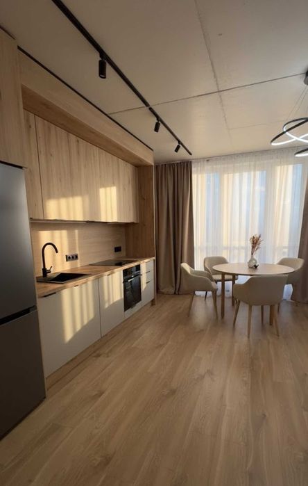 - Простора кухня-вітальня з вікнами в підлогу