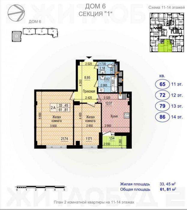 Салтівський; ЖК Пролисок 2-х комнатная квартира 61,81 кв.; В продаже 2-х комнатная квартира ЖК Пролисок дом 6, секция 1, площадь 61,81 кв/м., экв. 50 т. $.,продажа по переуступке прав собственности.