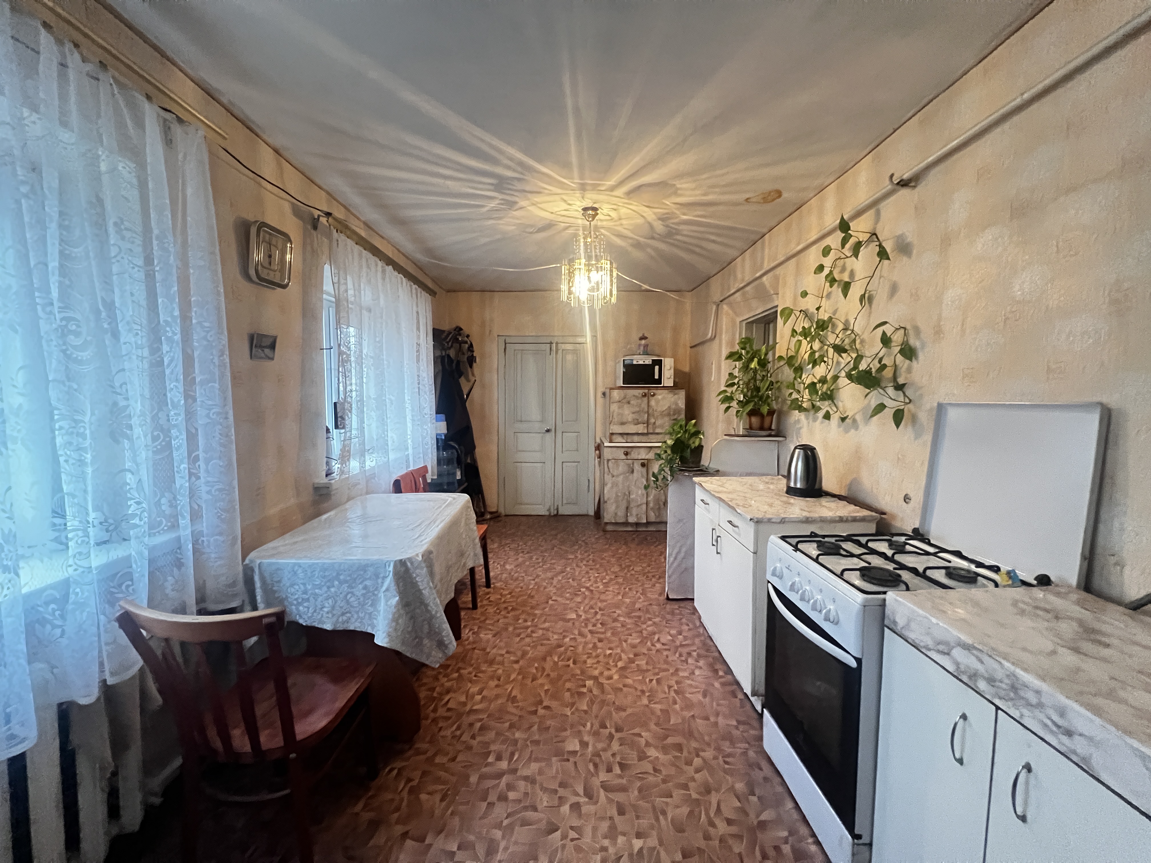 У будинку три кімнати, кухня 12 м², санвузол суміжний. Опалення індивідуальне газове, є світло, власна свердловина, каналізація — септик. Дах шиферний.
