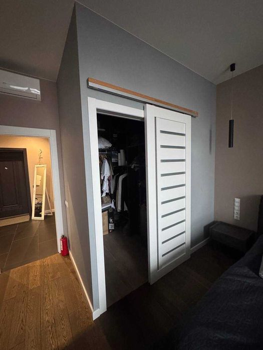 Велика прихожа з домофоном та шафою для одягу.