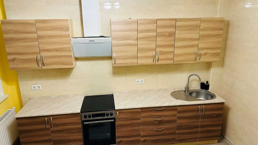 Побутова техніка: холодильник, варильна поверхня, духовка, витяжка, кондиціонер, пральня машина, телевізор.
