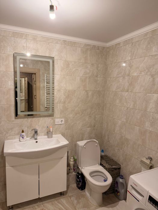 Ванна кімната повністю обладнана, встановлене сучасне дзеркало з підсвіткою.