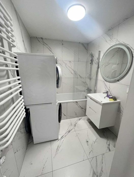 У ванній кімнаті — пральна та сушильна машини Bosch.