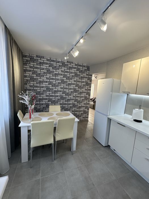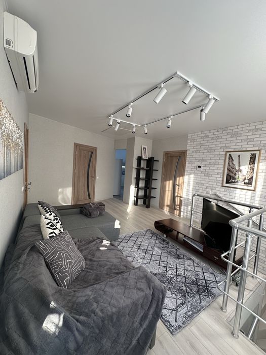 Планування: дві спальні, простора зала, ванна кімната та окремий санвузол. Кухня повністю укомплектована ключовою технікою — газова плита, витяжка, холодильник, мікрохвильовка, електрочайник, обідній стіл. У кухні та одній зі спалень встановлені теплі підлоги. У ванній є пральна машина.