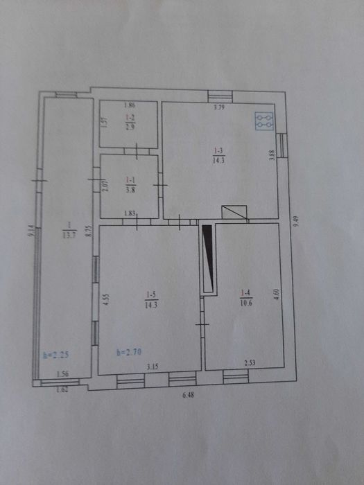 1. Житловий будинок 1946 року забудови. (9,49х6,48),фундамент-цегляний щебінь, стіни глінохворостяні обкладені цеглою під оцинкованою кровлею. До будинку прибудована веранда (2,7х1,62 м); Фото 1,2,15,23.