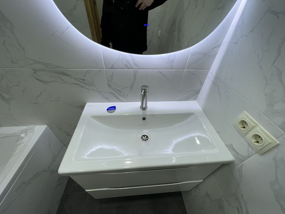 • У ванній кімнаті — нова акрилова ванна, умивальник із тумбою, дзеркало з підсвічуванням, сучасна сантехніка та вентиляція.