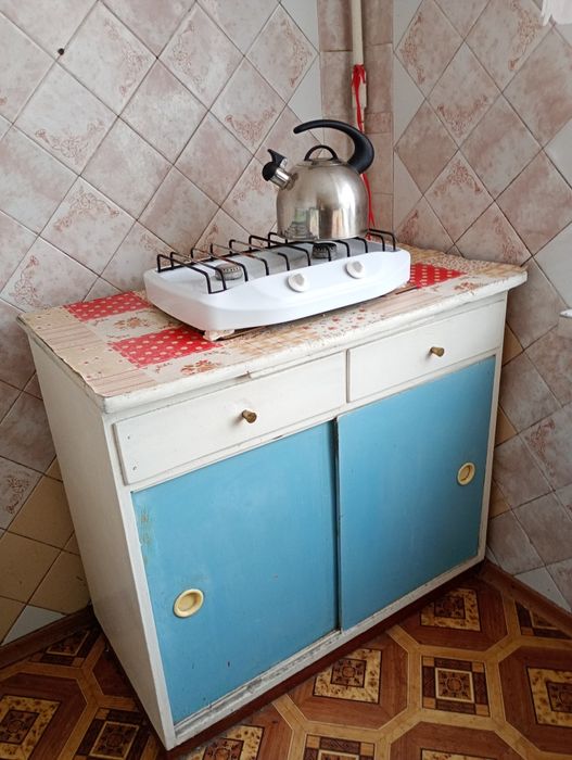 На кухне стол обеденный+стол кухонный,шкаф для посуды, табуретки, стиральная машина,чашки,тарелки,чайник,кастрюли.