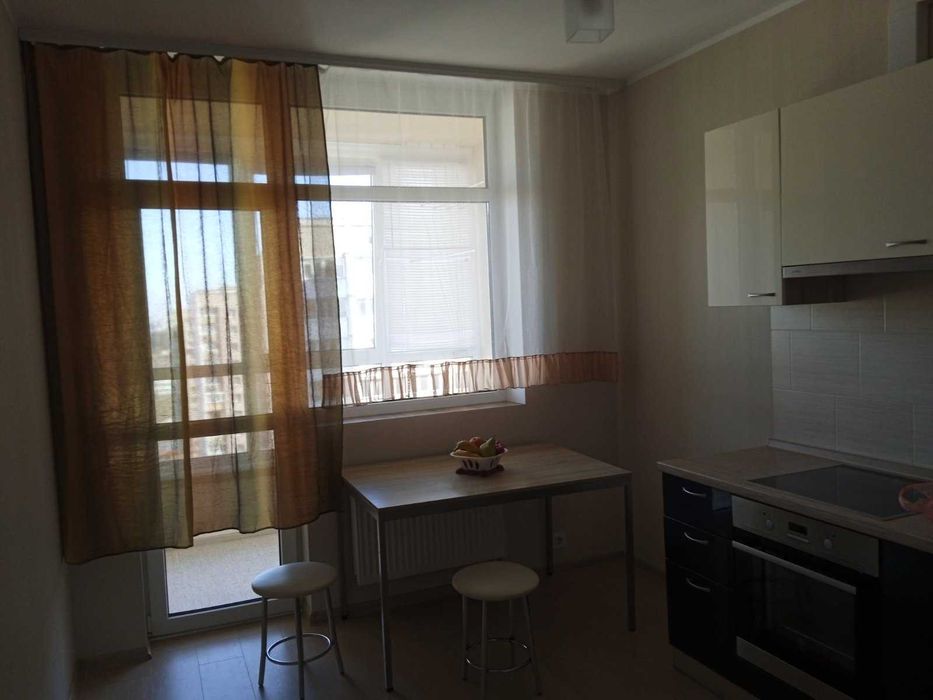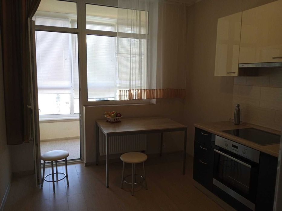 Просторная укомплектованная мебелью и техникой кухня переходит в застекленную лоджию с прекрасным видом.