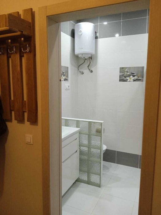 Санузел: душевая кабина, бойлер, стиральная машина, умывальник с тумбой, зеркало, унитаз отделен практичной ширмой со стеклоблоков. Счетчики на воду и отопление.