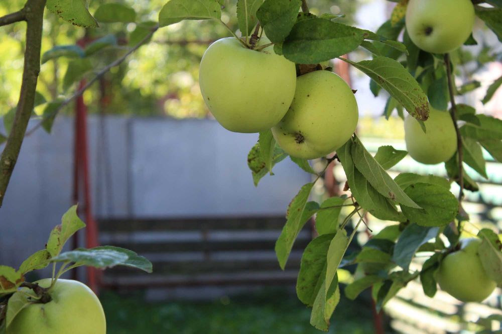 На ділянці - грядка, фруктові дерева, кущі.