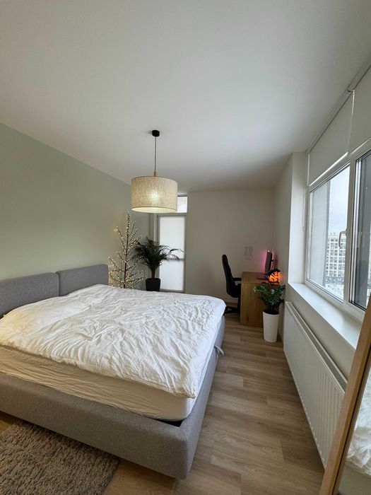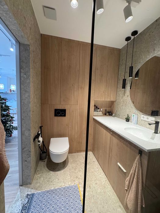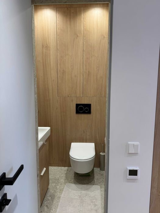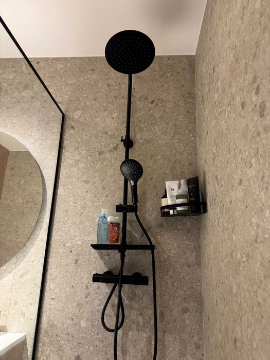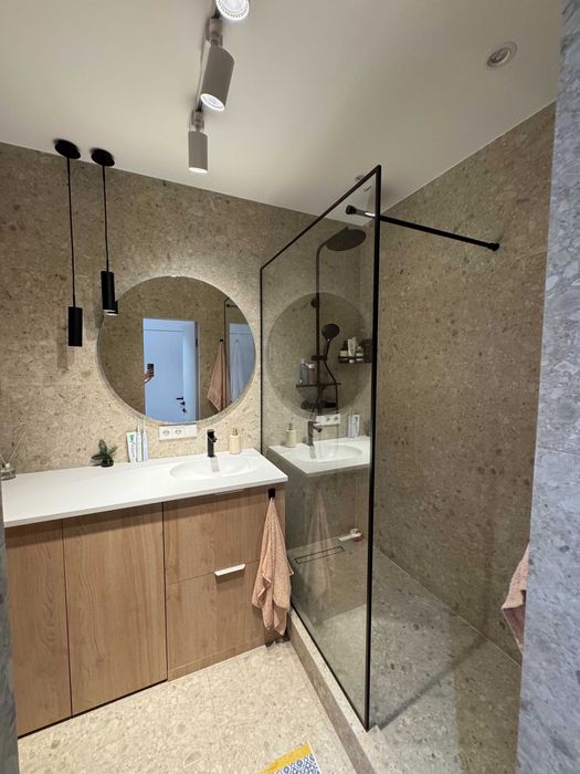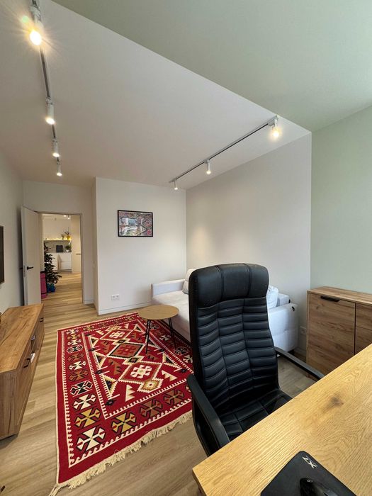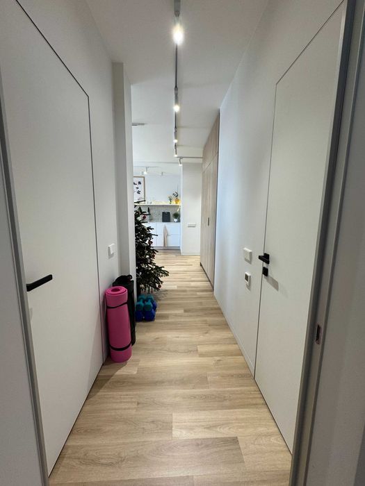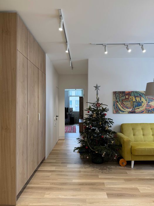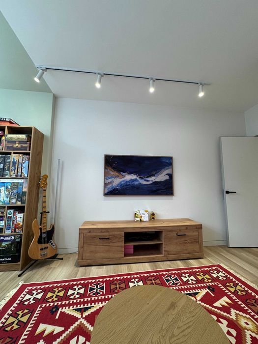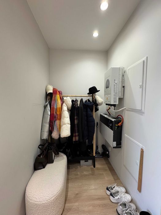 По техніці є все що треба, посудомийка, пральна машина з сушкою, тепла підлога у СУ (також при вході), кондиціонер, вбудований холодильник і морозилка, духова шафа, індукційна поверхня, бойлер, ТВ 55" Samsung Frame. По всій квартирі плінтуса прихованого монтажу і двері в рівень зі стіною. Великий незасклений балкон. Вхідний фільтр на воду грубої очистки + проточний фільтр на кухні.