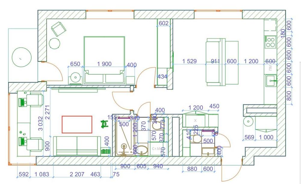 2 кімнатна з кухнею і двома санвузлами