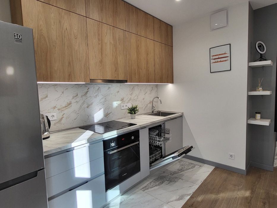 Квартира повністю мебльована: вбудована кухня та робочий стіл.