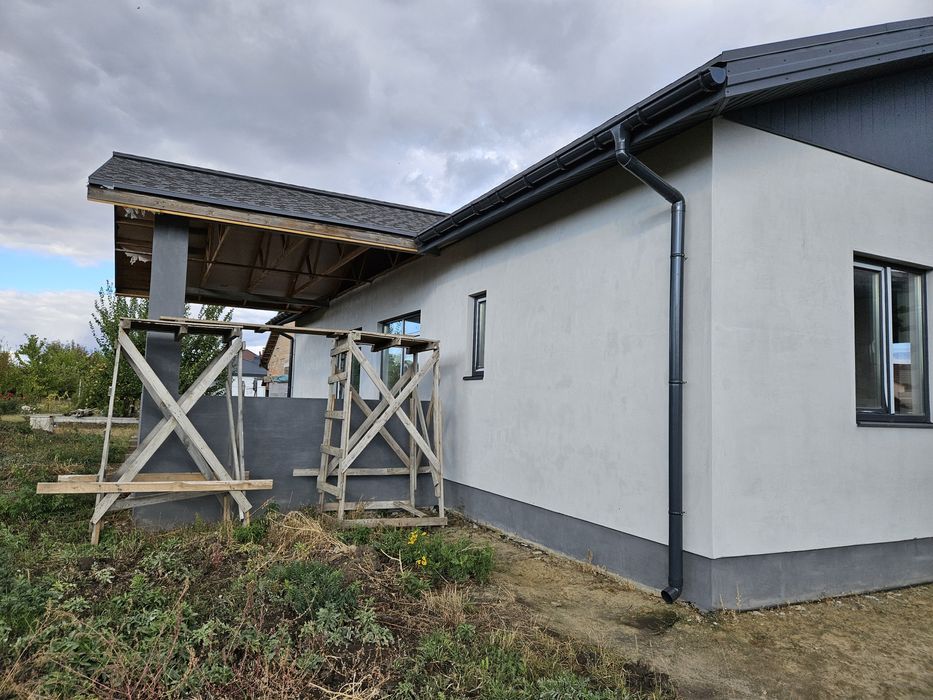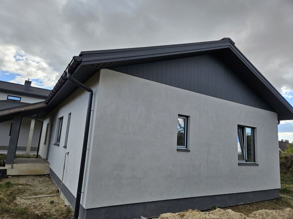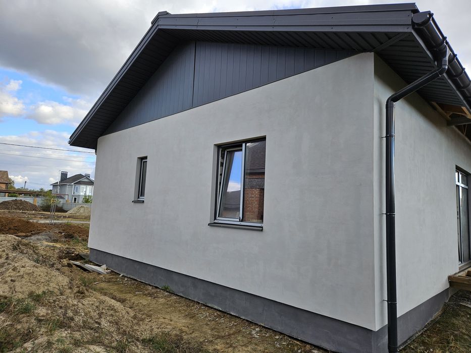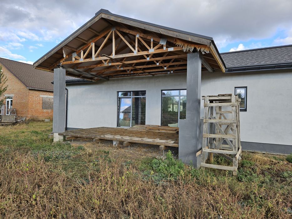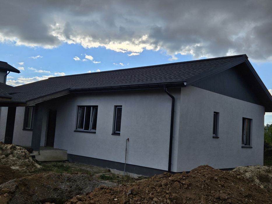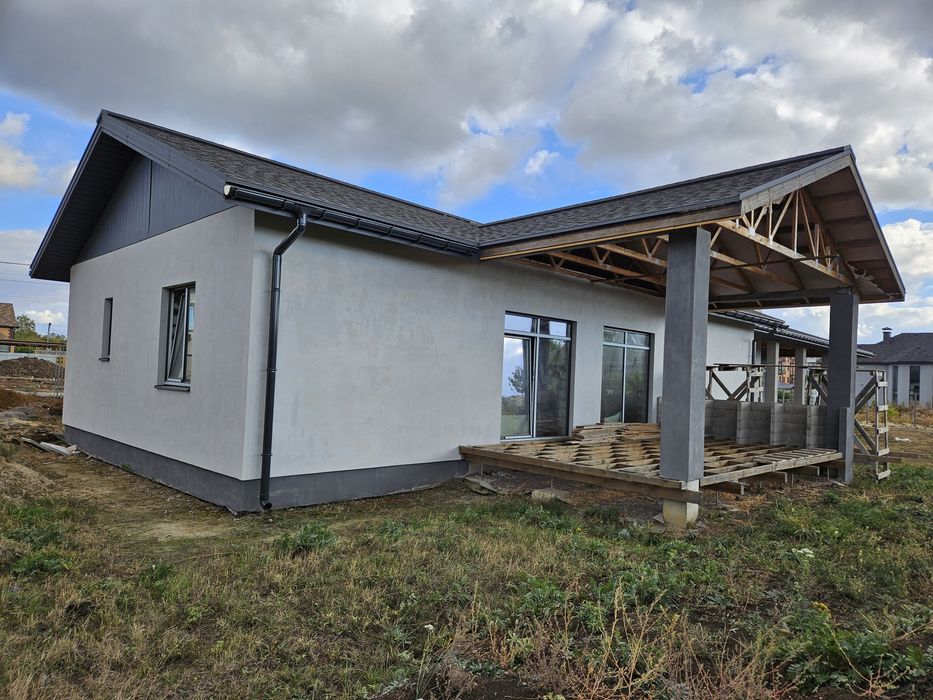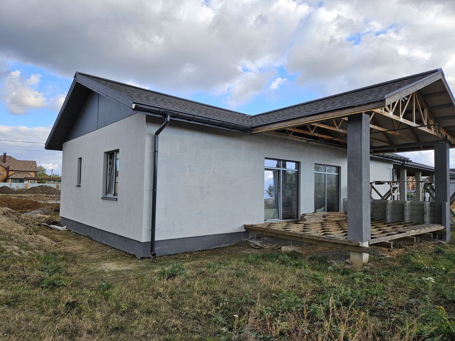 Стіни: пінобетон + зовнішнє утеплення мін.ватою, якісні пвх вікна. Побудований в 2022 році. Будувався для себе, тому використані якісні матеріали. Без внутрішнього оздоблення. Площа - 120м2, планування для оптимізації житлового простору. Велика тераса.