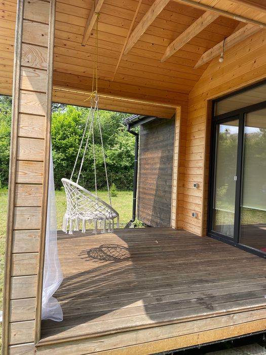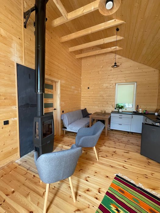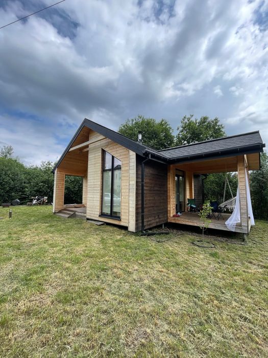 Сучасний будинок 45 м² з каміном і терасою біля лісу.; Продається сучасний каркасний будинок площею 45 м² у мальовничому місці — с. Любовичі, Львівська область. Це ідеальний варіант як для постійного проживання, так і для заміського відпочинку.