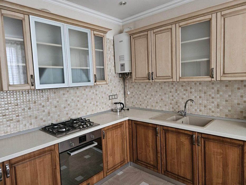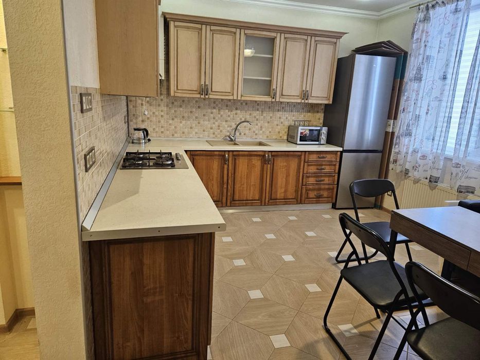 Кухн обладнана газовою поверхнею, духовкою, новим повнрцінним холодильником та новою микрохвильовою піччю.