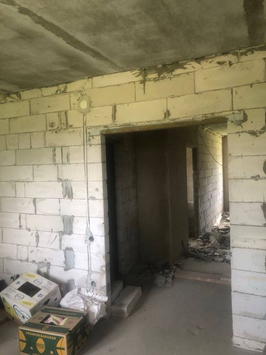 Будинок зданий та заселений. Утеплений фасад. Є всі комунікації: газ, світло, вода. В квартирі: частково штукатурка, МПВ, розводка. Право власності на руках.