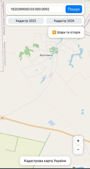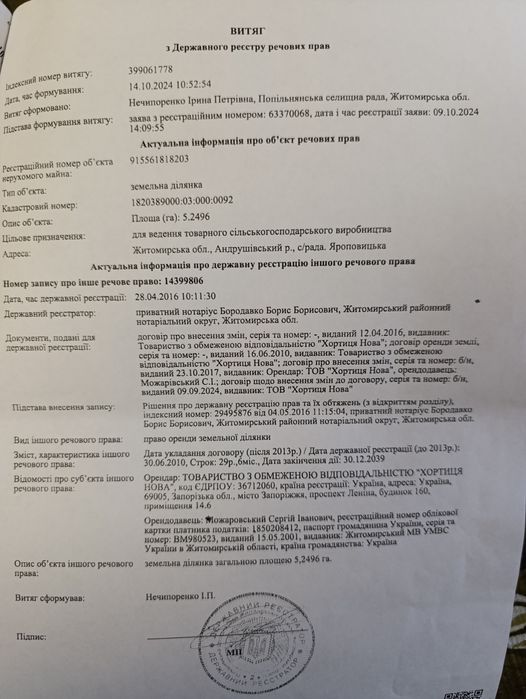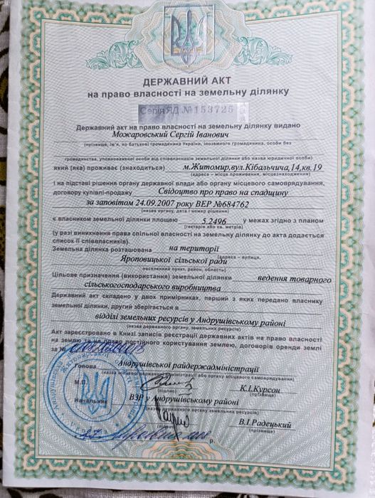 Продам земельний пай; Продам пай, біля дороги, в оренді до 2039 року, орендна плата 32000, рілля в обробці, площею 5.25 Га Житомирська область Бердичівський район с Яроповичі кад.номер 1820389000:03:000:0092