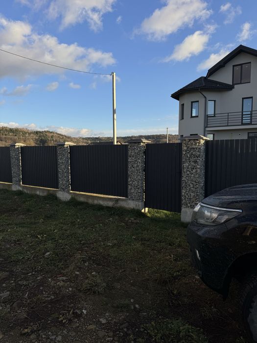 італійським профнастилом в колір на ленточному фундаменті. Виїздні ворота, стовпці з габіону. Гаражні ворота на етапі монтажу.