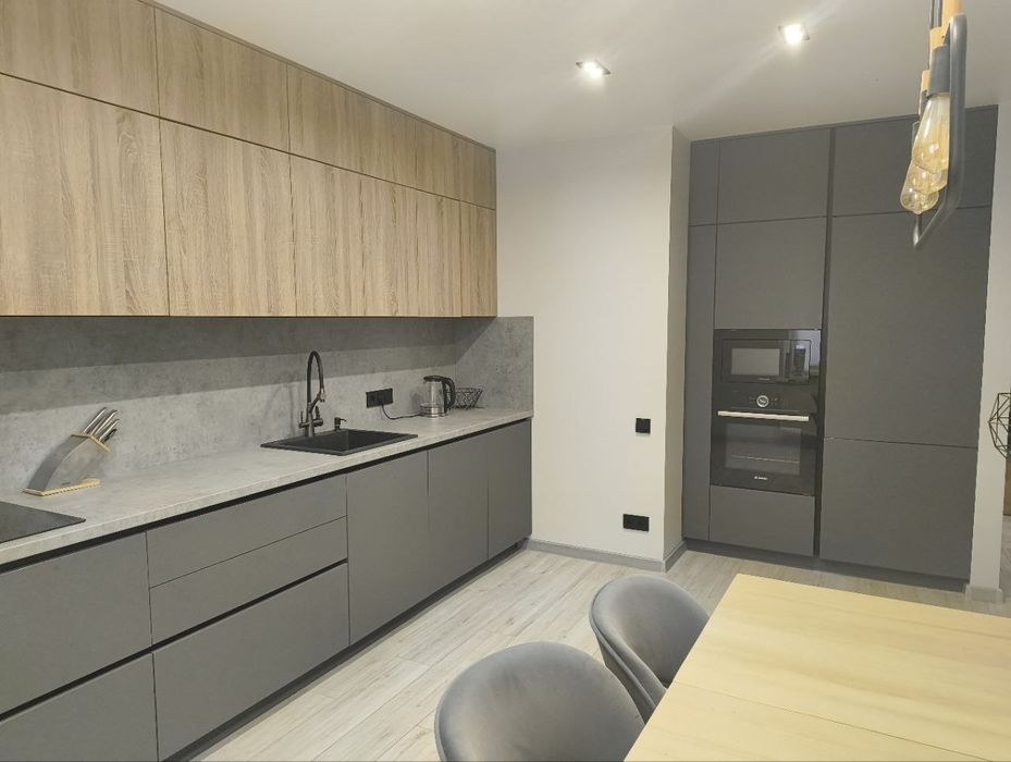 Кухня велика та світла, з великою кількістю зручних ящиків для зберігання.