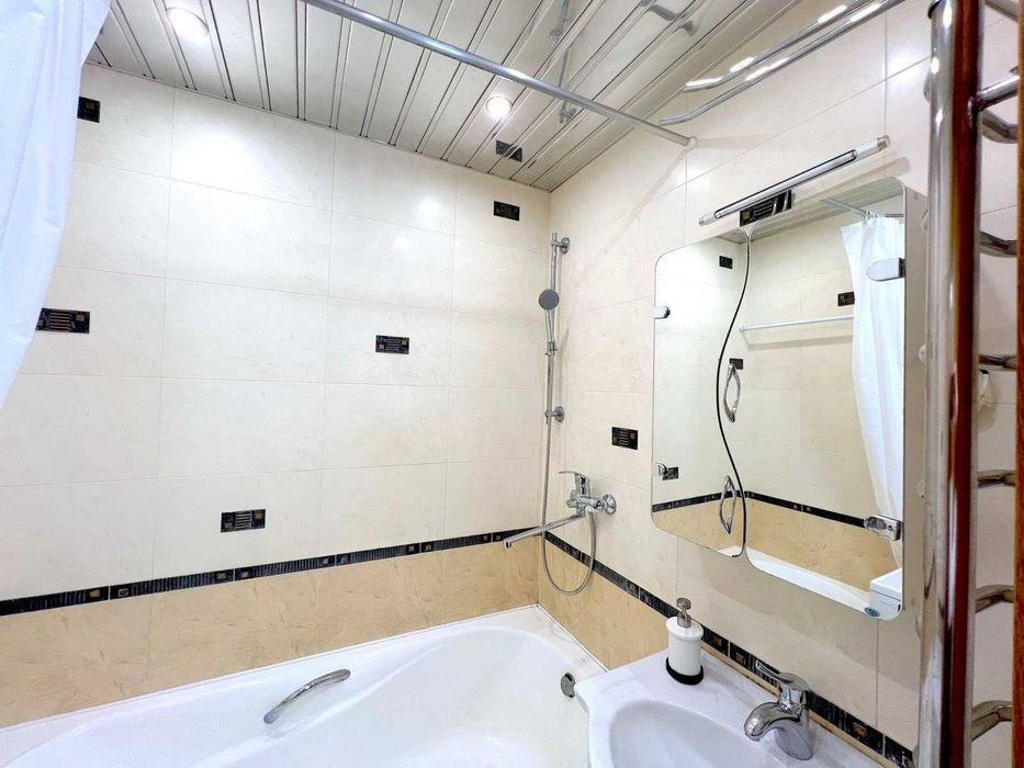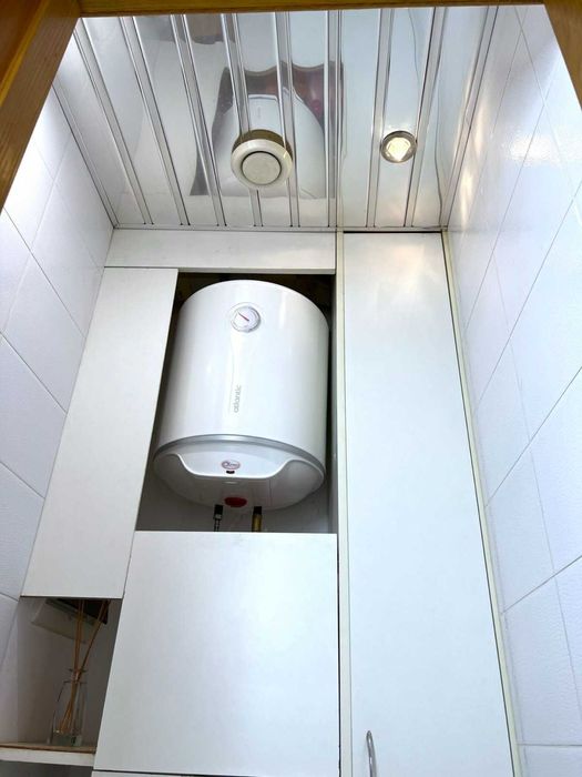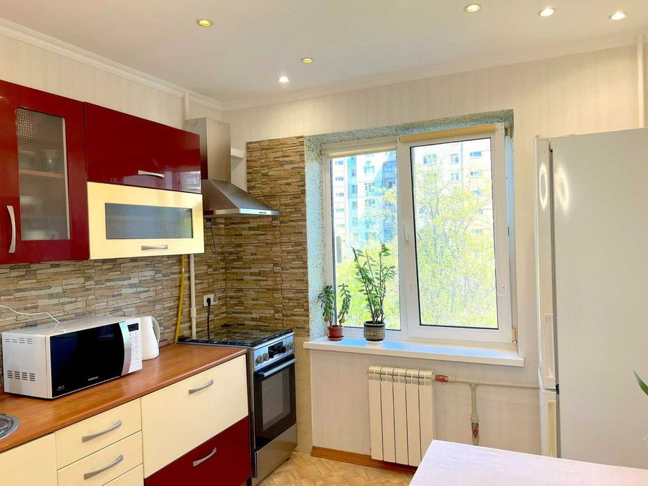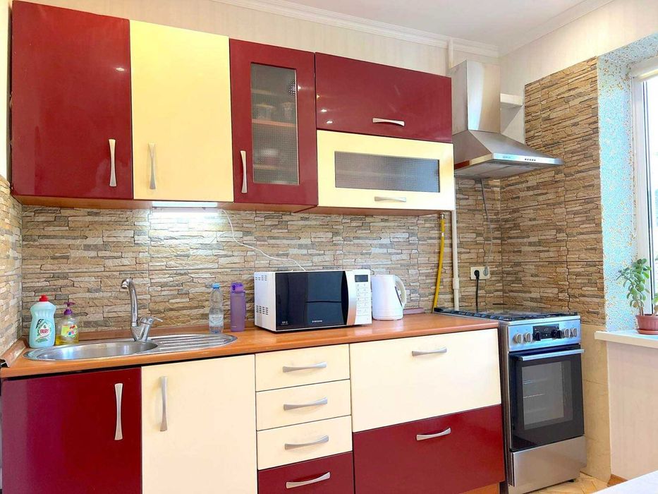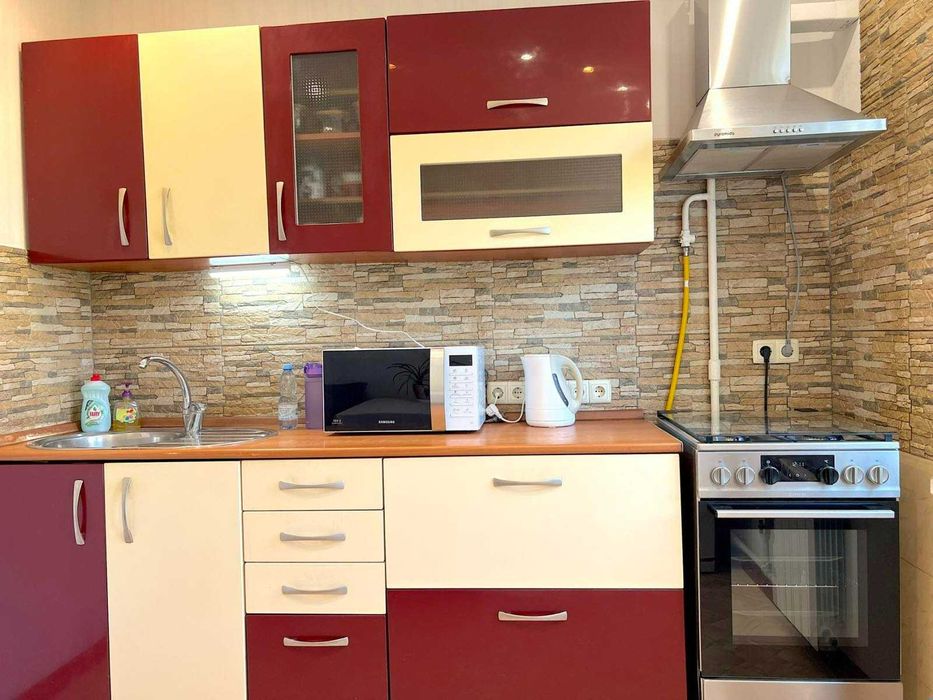 у доглянутому стані, повністю облаштована для комфортного проживання. Є електроплита, холодильник, мікрохвильова піч, чайник, посуд, праска з дошкою для прасування, телевізор 32″, пилосос, бойлер на 100 л, пральна машина, кондиціонер у великій кімнаті, Wi-Fi-роутер, а також сушка для білизни на балконі.
