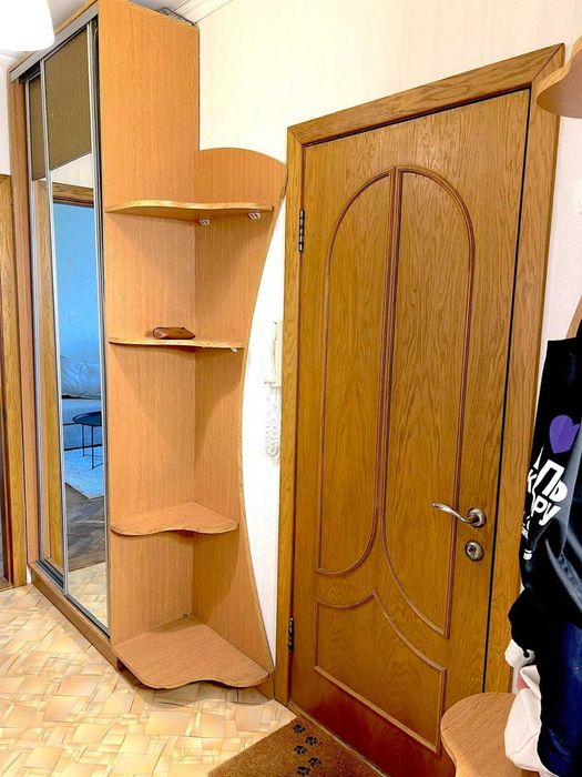 У спальні — двоспальне ліжко, комод і шафа; у великій кімнаті — розкладний диван, двоспальне ліжко та меблева стінка; у коридорі — шафа-купе. Кухня обладнана кутовим гарнітуром, обіднім столом зі стільцями та кавовим столиком із двома кріслами. На підлозі в кімнатах і коридорі — ламінат, на кухні та в санвузлах — плитка.