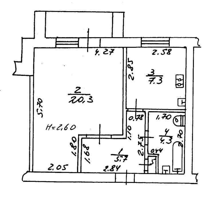 Комната 20.3м.кв., кухня 7.3, ванна+с.у. совмещенные 4.3 м.кв.