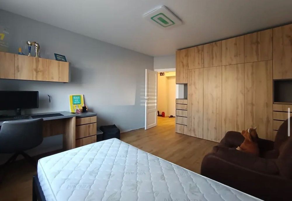 Спальня- Майстер, вхід з вітальні (двері прихованого монтажу), Гардероб відокремлений скляною перегородкою, спроектовано для чоловічих речей та речей побиту (рушники, постіль т.д) Вбиральня-майстер Вхід зі спальні, душова кабіна, ванна, гігієнічний душ. Великий гардероб (8 кв.) окрема кімната вхід зі спальні, спроектовано для жіночого гардеробу і зберіганню цінних речей, або переобладнати на робочий кабінет.