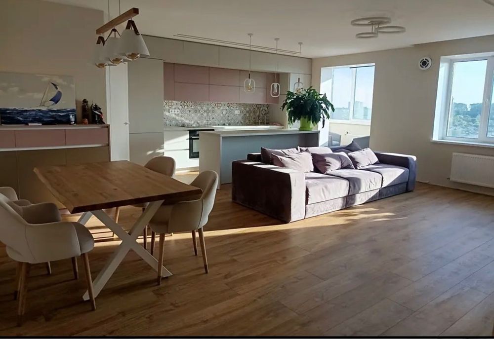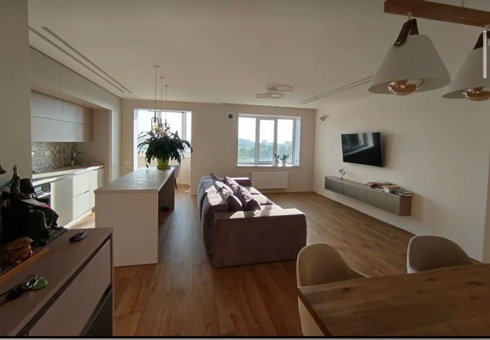 Вітальня 42кв, це Кухня з островом зона зберігання та приготування їжі, Обідня зона стіл на шість осіб, ТВ зона місце перегляду телевізора, Лоджія маленька зона відпочинку, відокремлена пральня зона для зберігання, прання та сушіння речей.