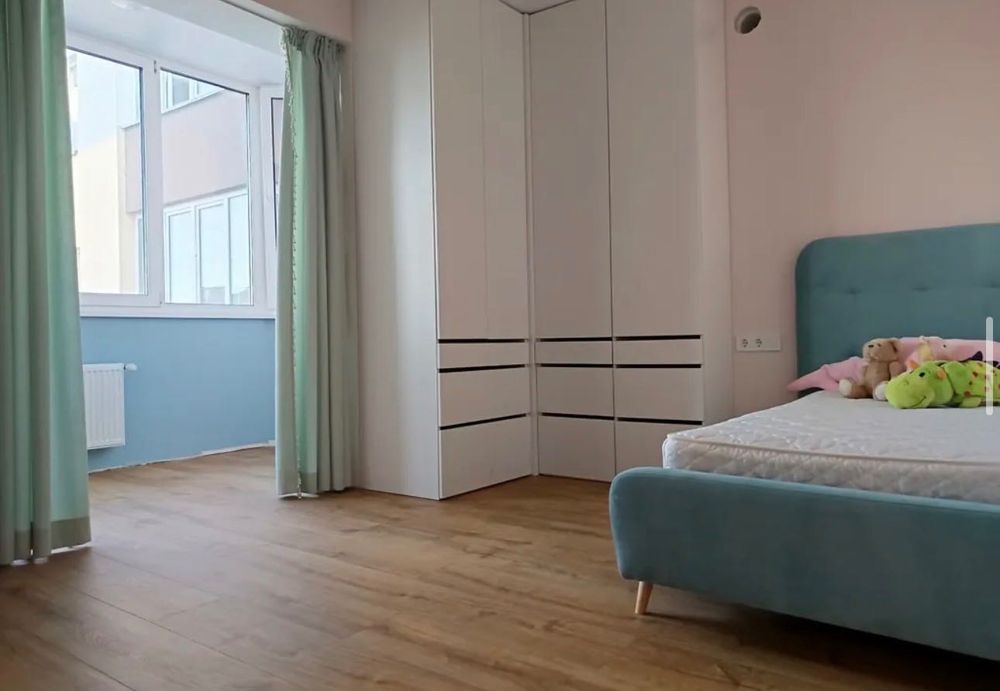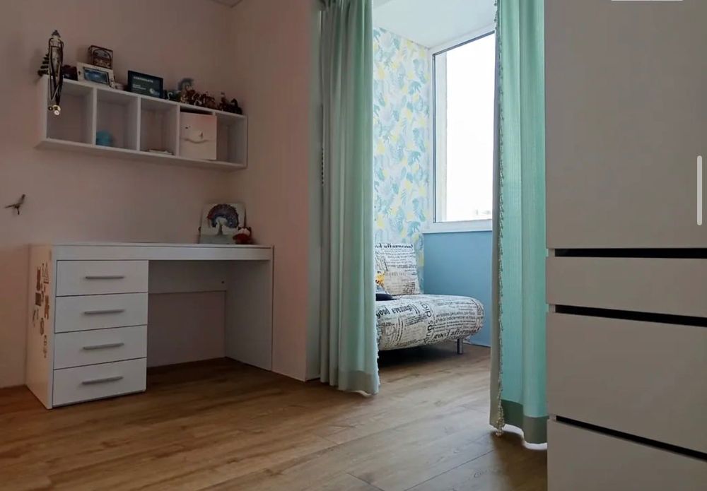 Дитяча для дівчинки, повноцінна кімната з розкладним диваном як додаткове гостьове спальне місце, лоджія як ігрове місце.