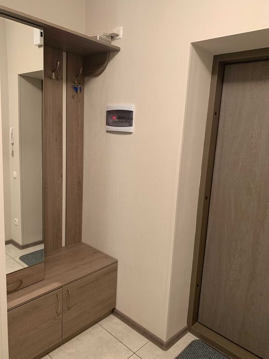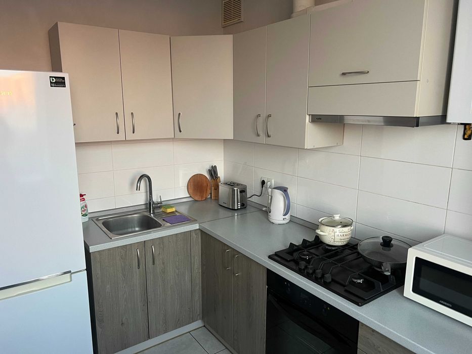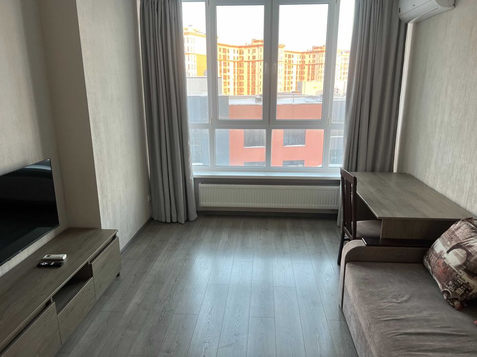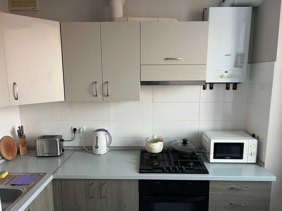 Вбудована кухня, варочна поверхня(газова), електродуховка, витяжка, холодильник, мікрохвильовка, тостер, електрочайник. В ванній пральна машина автомат, душова кабіна, умивальник, унітаз. В кімнаті кондиционер, Смарт-ТВ, пилосос, раскладной двуспальний диван, шкаф-купе, письмовий стіл, обідній стол, стулья, посуд та інше.