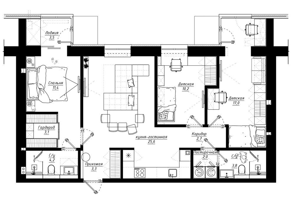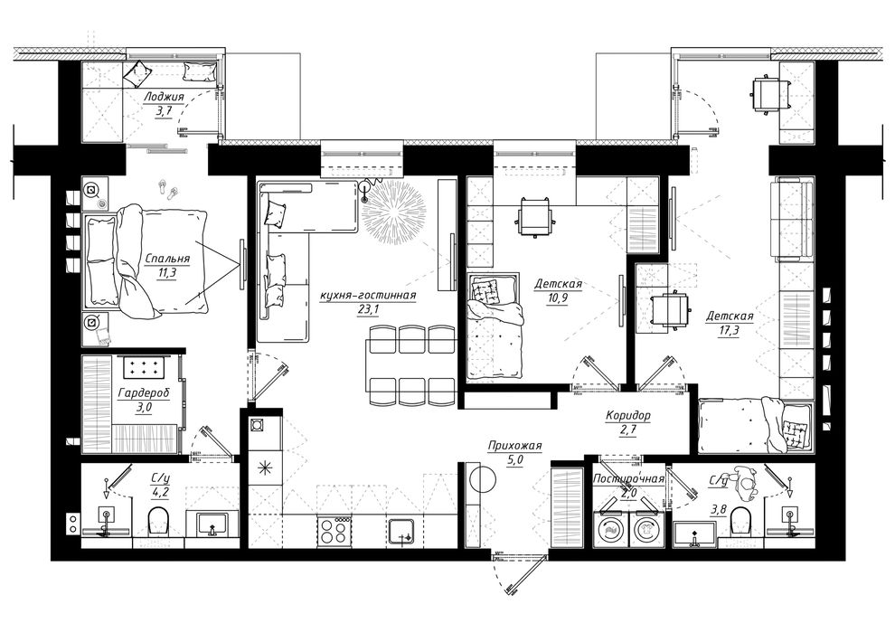• Можна виділити 3 окремі спальні