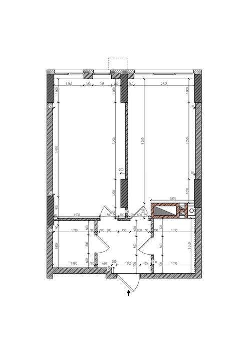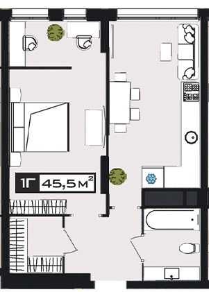 1-но кімнатна: кухня (15,6м2), спальня (17,64м2), кладова/гардероб(3,55м2), санвузол(4,15м2), передпокій (4,96м2).
