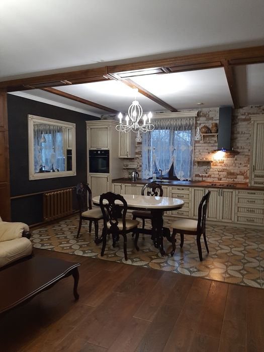 Кухня, 3 комнаты, 2 санузла, гардиропная комната, гладильная комната. Отопление газовое, дровяное. Гараж на 2 автомобиля, сауна, летняя кухня, сарай, вольер для собаки. Участок 20 соток