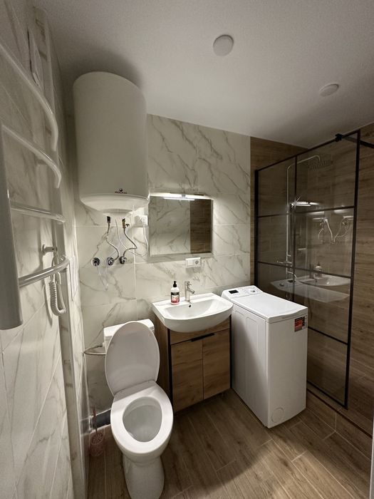 Туалет и ванная объединенные. Есть стиральная машинка и полотенцесушитель.