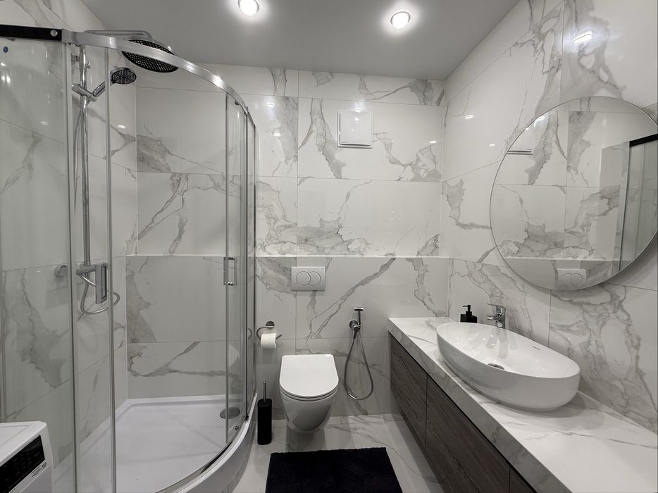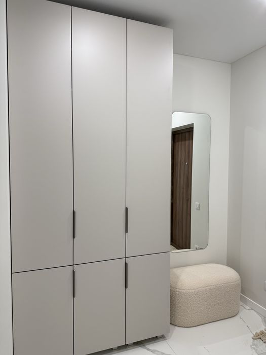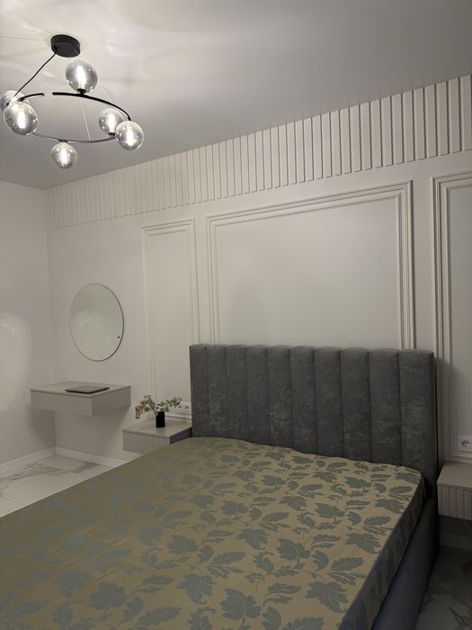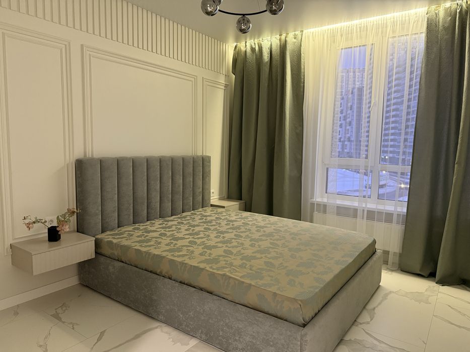 Квартира укомплектована меблями та технікою: посудомийна машина, пральна машина, телевізор Smart TV, кондиціонер, холодильник, варильна поверхня та духова шафа. Підігрів підлоги в санвузлі. Планування: євро-двокімнатна - кухня студія + окрема спальня з великою гардеробною кімнатою.