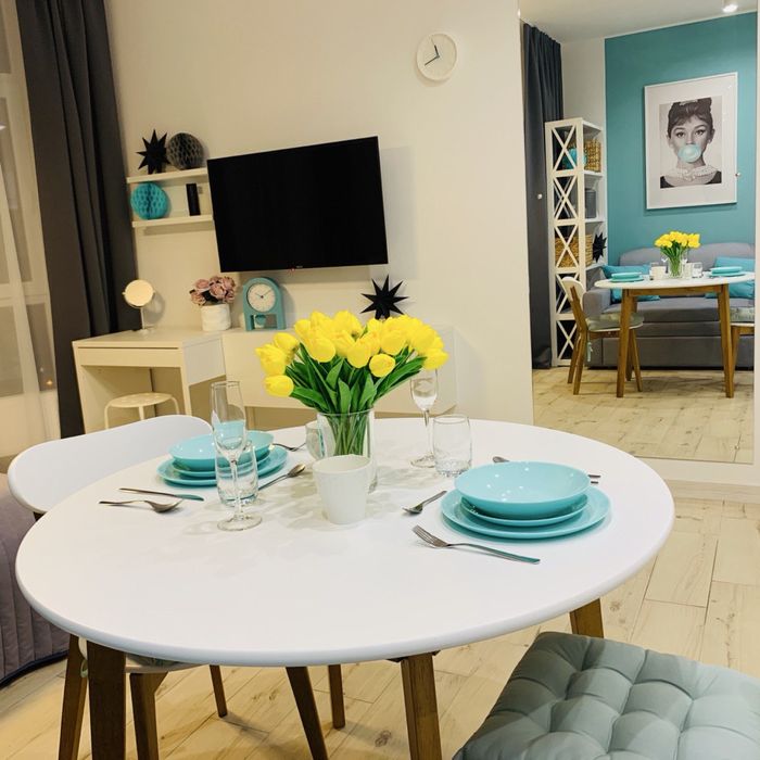 В квартирі є: шафа, великий комод, просторе ліжко, розкладний диван, робочий стіл з кріслом, обідній стіл, полиці для дрібниць, телевізор зі смарт TV, кондиціонер, wifi (оптоволокно), праска, дошка для прасування, набір посуду/каструль повний.