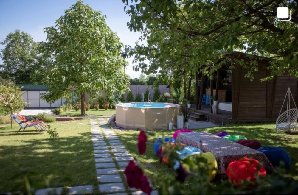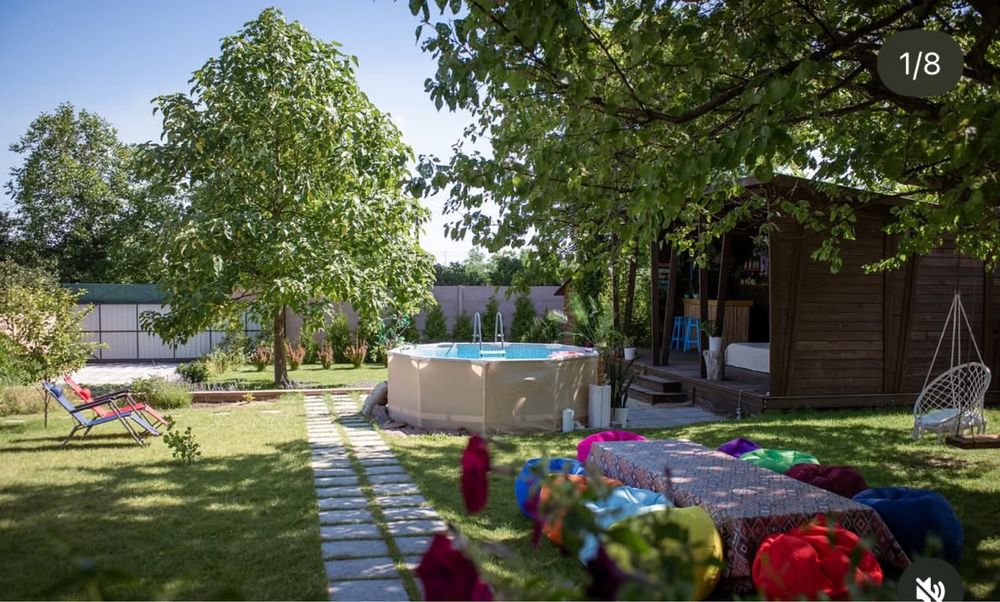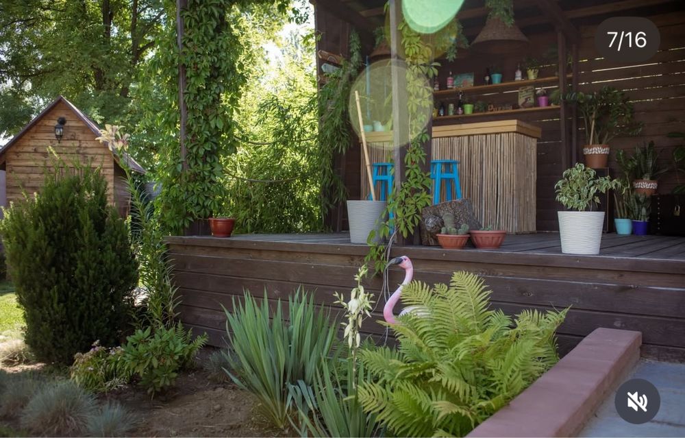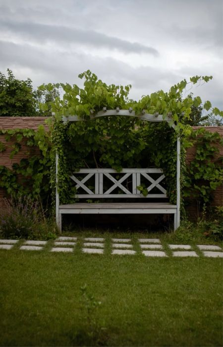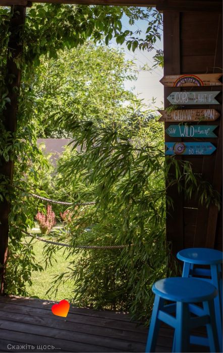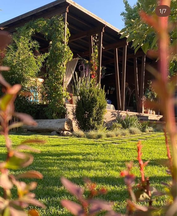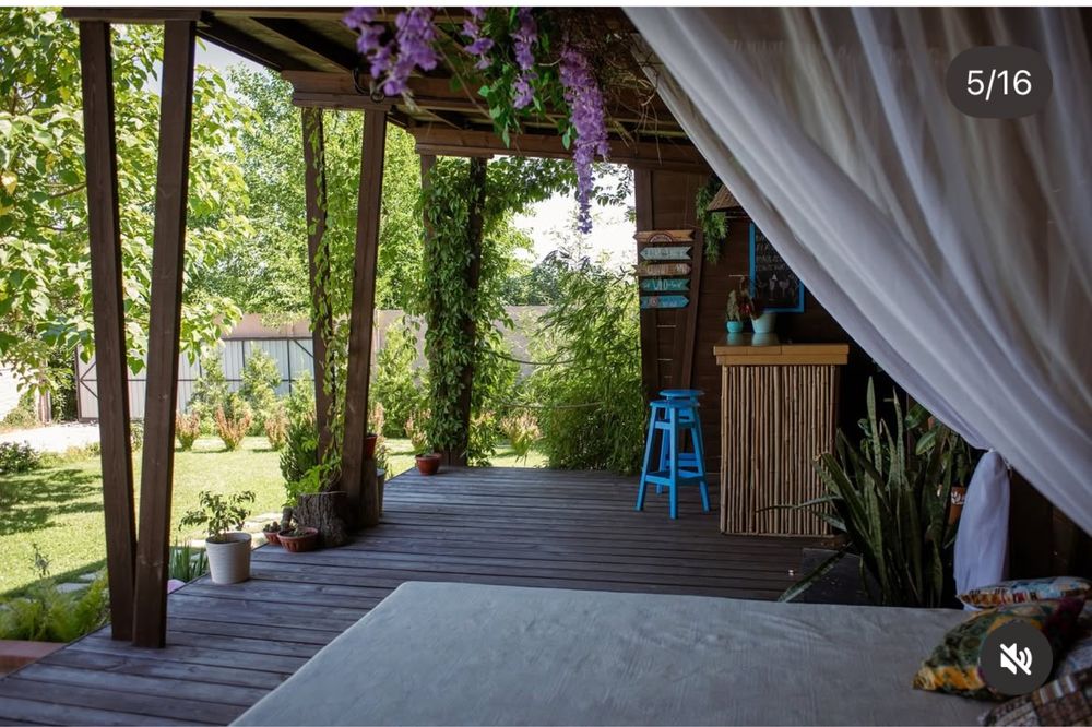 Дерев’яна пергола, повита плющем і виноградом, створює атмосферу затишку.