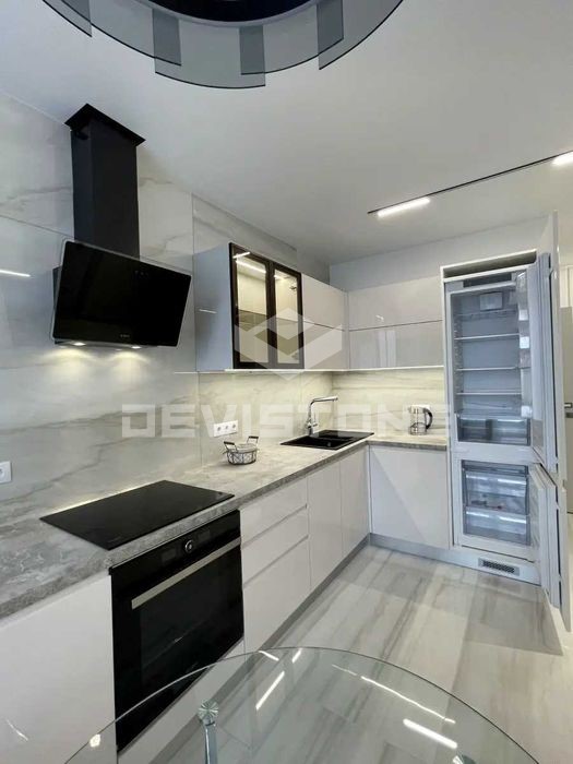 Квартира укомплектована італійською побутовою технікою: посудомийна машина, духова шафа, індукційна варильна панель, прально-сушильний автомат, вбудований холодильник, бойлер, кондиціонер, підігрів підлоги, система очищення води..
