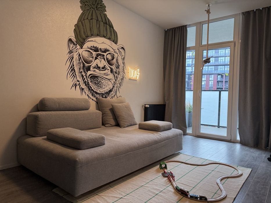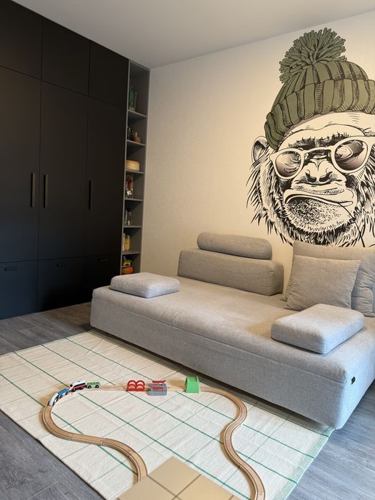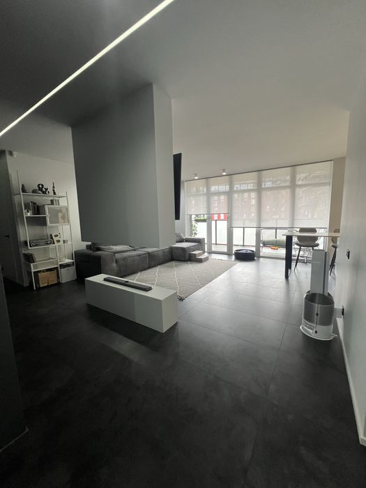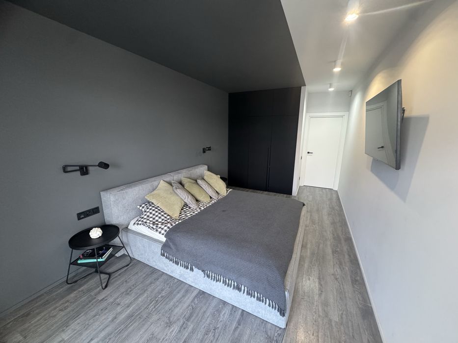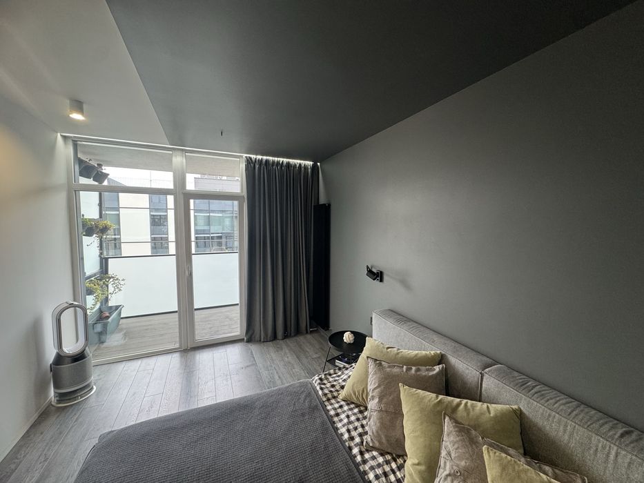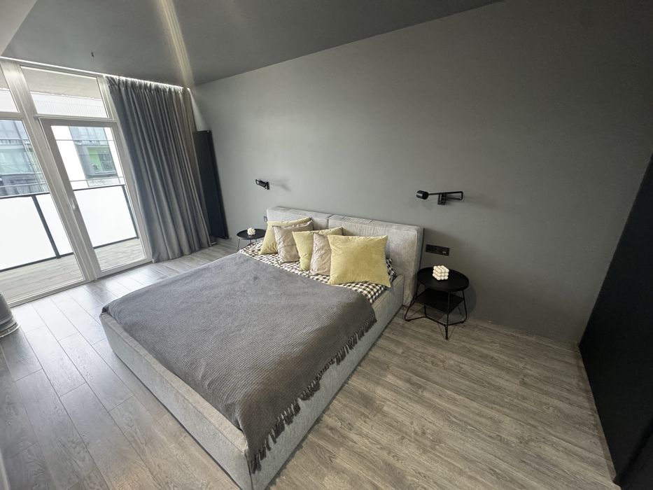 Сучасна квартира з дизайнерським ремонтом, простора кухня-студія 55кв.м., спальня, дитяча кімната, санвузол душ+ванна, технічне приміщення-пральня. З кухні-вітальні і дитячої є вихід на простору терасу, вікна виходять у двір. З спальні вихід на балкон з видом на Високий замок.