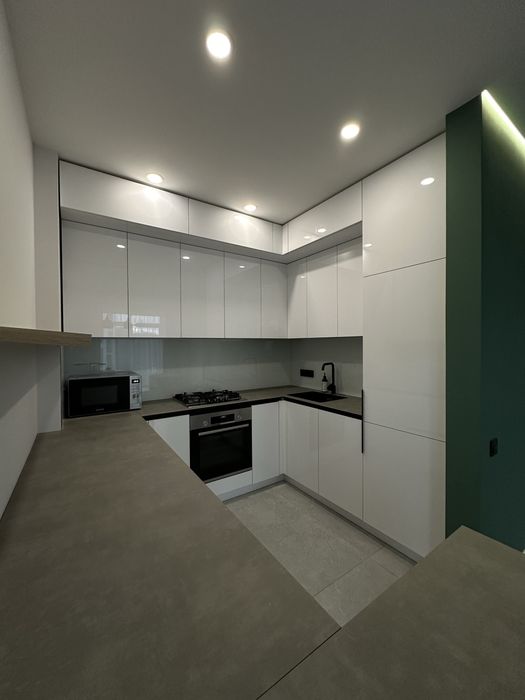 - вмонтовані кухонні меблі та вся необхідна побутова техніка - газова поверхня, електрична духова шафа, вмонтований холодильник, вмонтована посудомийна машина, витяжка кухонна,