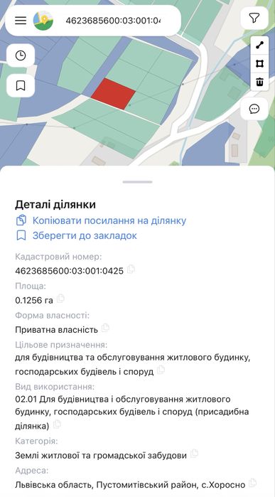 Земельна ділянка 0,125 сот. у с.Хоросно під будівництво/інвестицію; Ціна вказана за 1 сотку. Поруч ще є дві ділянки для продажу, загальна площа трьох 0,377 сот.